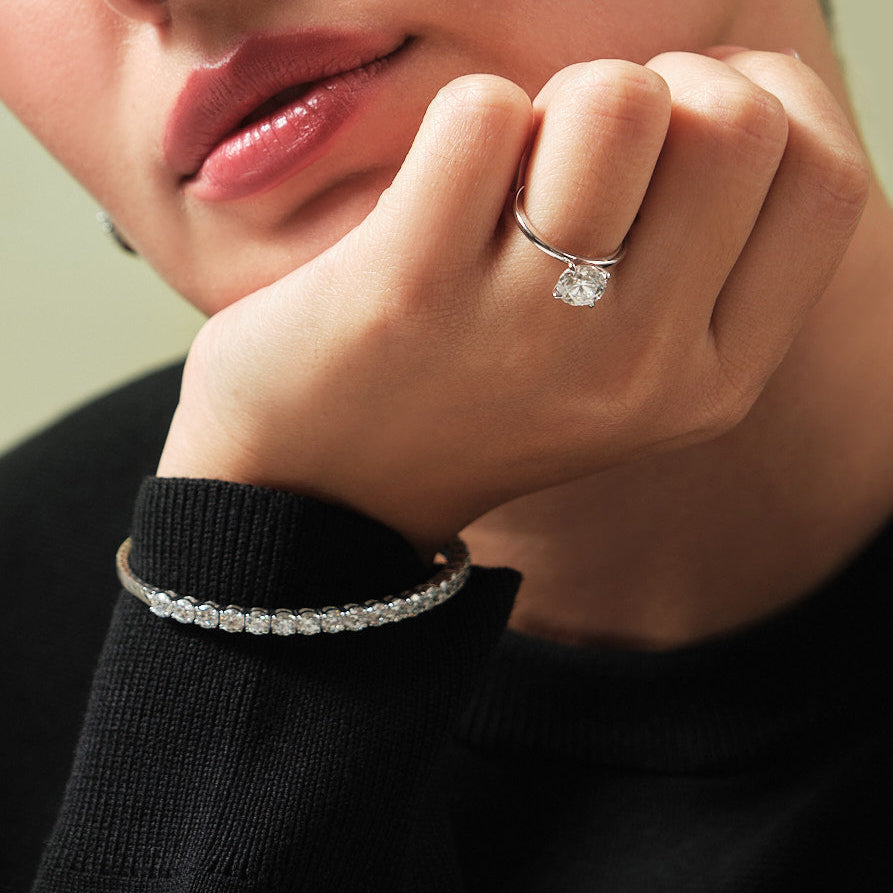 Made with our innovative technology, first of its kind - a half-eternity tennis bracelet made using a special flexible bangle, it sits comfortably on the wrist and lives life with you.